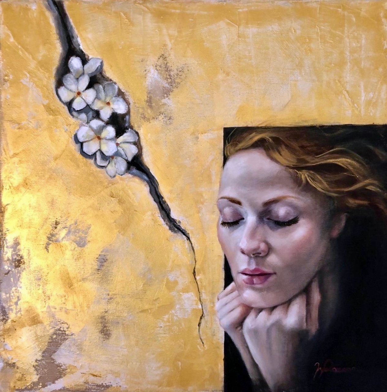 In questo dipinto, ho esplorato la delicata interazione tra bellezza e fragilità. L'intensa palette di gialli e oro simboleggia un barlume di speranza e nobiltà, mentre il contrasto con il viso pensieroso della donna riflette una meditazione interna profonda. Ho scelto l'olio per la sua capacità di catturare la luce e conferire profondità emotiva, evocando così un senso di introspezione e resilienza.