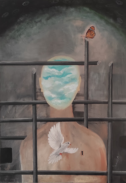 Il quadro raffigura la sagoma del busto di una persona in parte dietro le sbarre ed in parte oltre. Il viso è un pezzo di cielo con le nuvole viaggianti. una farfalla e posata sulla fine di una sbarra e una colomba vola libera tra le fenditure delle sbarre. Al posto del cuore c'è un buco della serratura e la sagoma resta evanescente mentre lo sfondo è cupo..