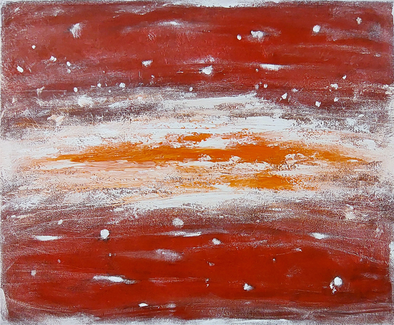 Le l... ( leggi tutto )inee orizzontali, dense e terrene, trattengono il fuoco in catene serene. E i puntini di bianco sparsi in alto e in basso, sono cenere d'oro, scintille a ogni passo.