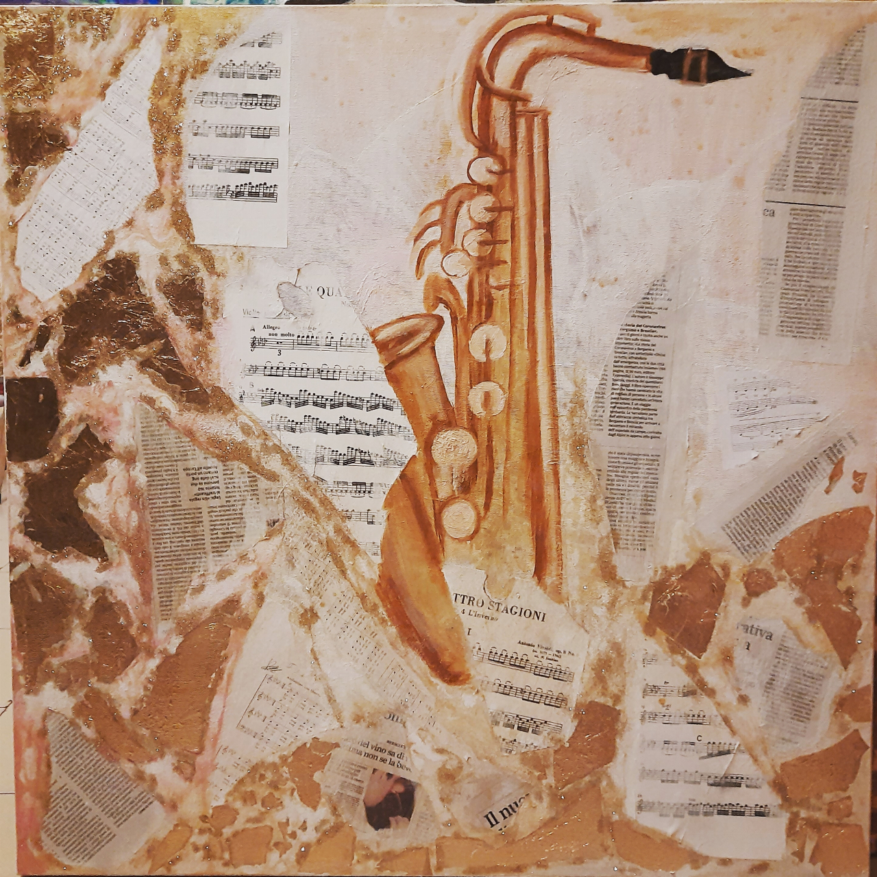 L'opera è di bordi alti non di tela classica, va senza la cornice . É in Acrilico con fogli di spartiti strappati o bruciati in parte . É firmata davanti al quadro . É pezzo unico di mia fantasia