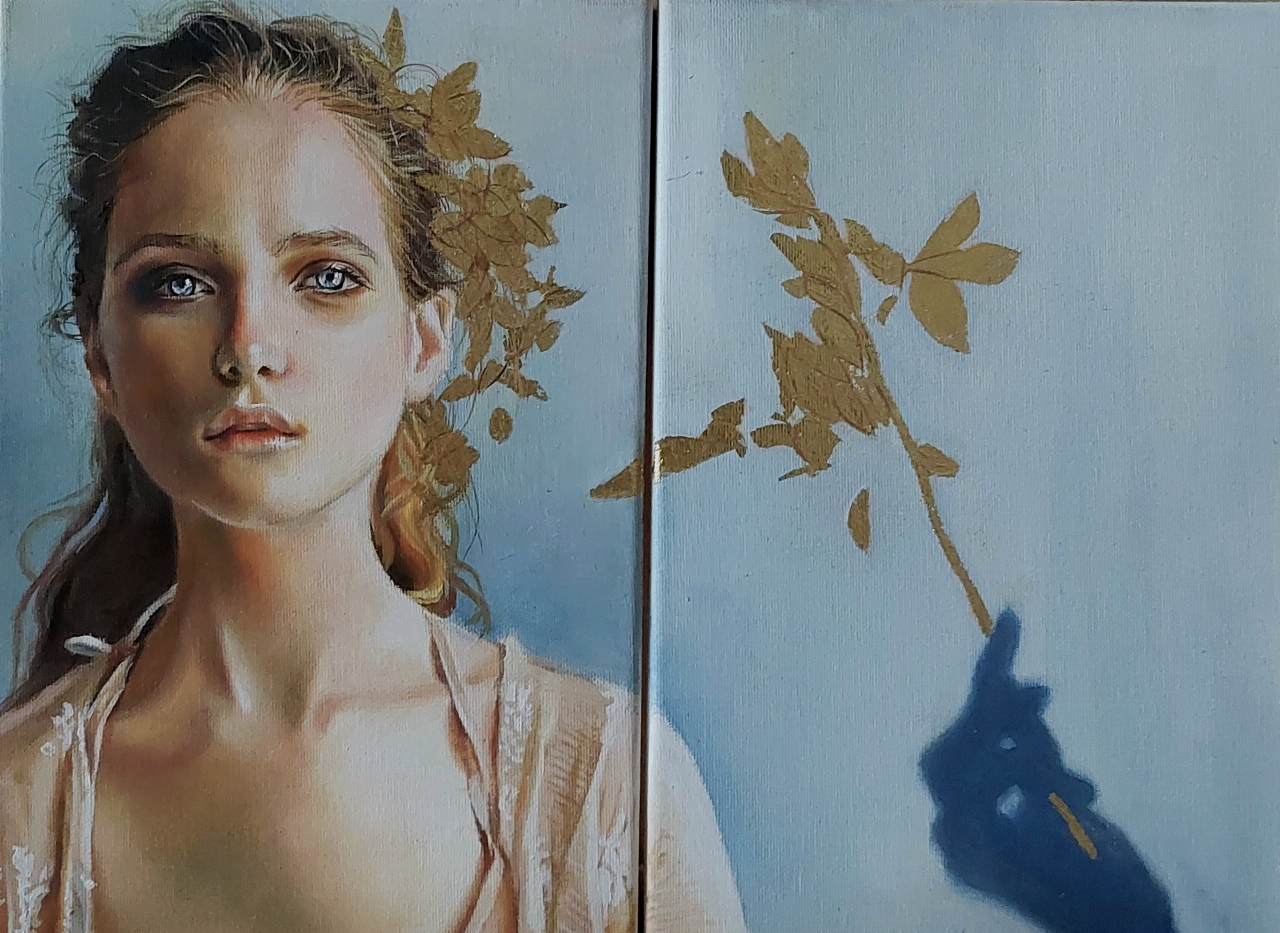 donna, ritratto, blu, oro, dittico, perdiata, mancanza, presenza, malinconia