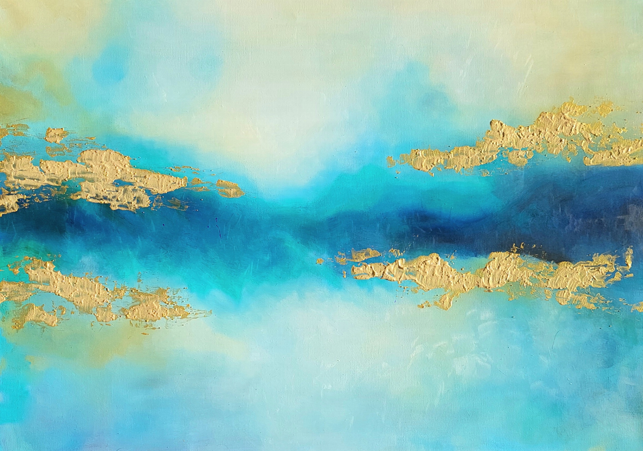 L’opera rappresenta l’incontro tra profondità e luce. Il blu, che sfuma dall’azzurro chiaro al cobalto intenso, richiama l’acqua, il cielo e l’infinito interiore — uno spazio di quiete ma anche di mistero. Le forme dorate, irregolari e materiche, sembrano terre emerse, isole o frammenti di luce che affiorano dalla vastit&... ( leggi tutto )agrave;: simbolo di ciò che di prezioso nasce anche nelle profondità più oscure.