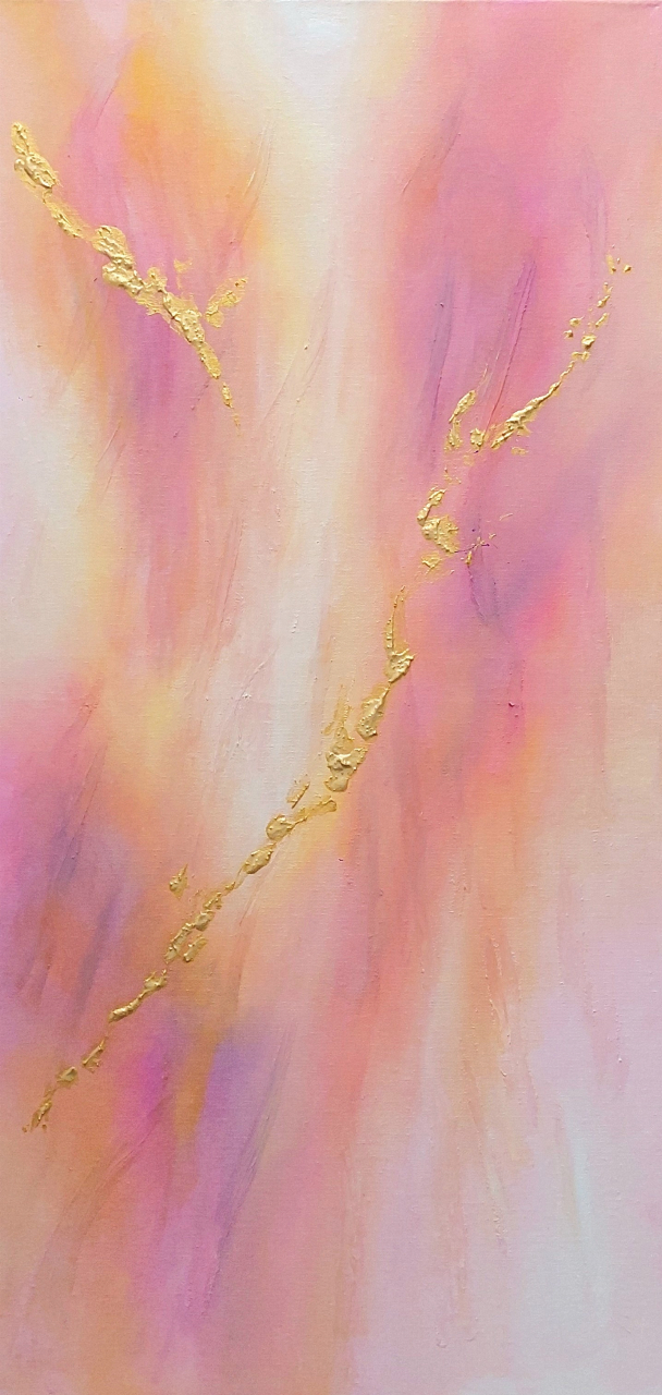 L’opera esplora un paesaggio emotivo astratto, costruito attraverso delicate velature di rosa, pesca e lilla che si fondono in un ritmo morbido e verticale. Le incisioni dorate attraversano la superficie come vene luminose, evocando l’idea di una forza vitale che emerge dalla fragilità. Il contrasto tra la morbidezza cromatica e la materia preziosa dell’oro suggerisce un dialogo tra intimità e luce, tra vulnerabilità e resilienza. L’insieme trasmette una sensazione di quiete sospesa, invitando l’osservatore a una contemplazione lenta e sensoriale.