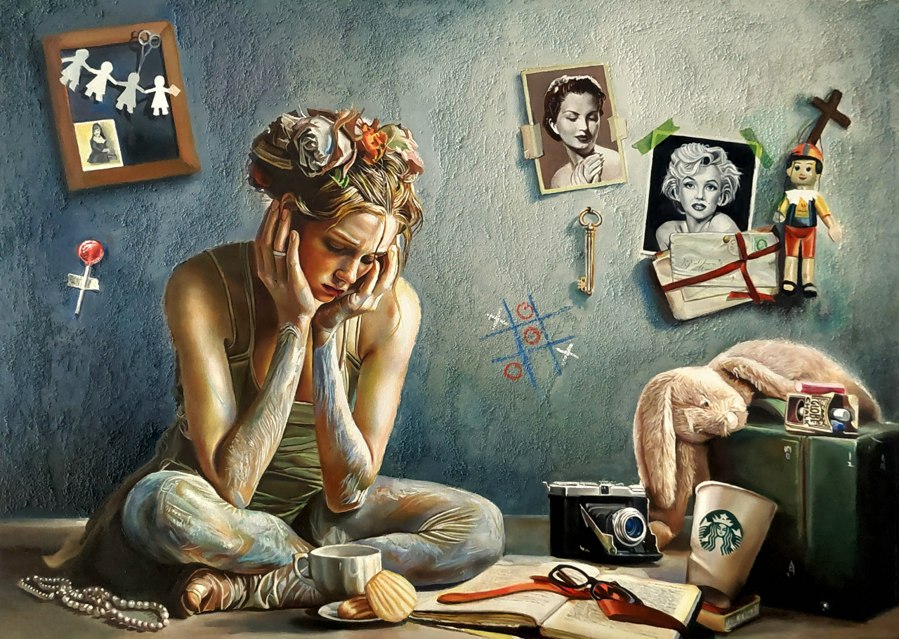La figura centrale, raccolta e silenziosa, vive immersa nei propri ricordi, mentre gli oggetti attorno diventano frammenti di vita: una madeleine visiva, capace di risvegliare emozioni dimenticate.