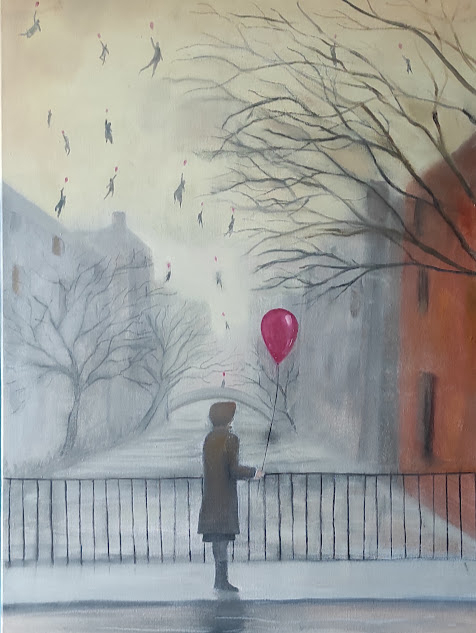 Il quadro rappresenta una ragazza ferma per strada, con un palloncino rosso in una mano. Lei è di schiena perché guarda verso il ponte distante, dove c'è una persona ferma che ha tra le mani il palloncino come lei. L'atmosfera è grigio nebbia, nel contesto di una cittadina con un fiume che scorre tra i palazzi, mentre nel cielo si vedono persone volare via con i pa... ( leggi tutto )lloncini scoppiati. L'autore vuole rappresentare il fiato sprecato di inutili parole che sembrano costruire relazioni durature ,e che invece, troppo spesso, si perdono nel tempo. Le persone parlano, si raccontano e condividono, costruiscono relazioni che arricchiscono l'umanità. Eppure in questo tempo grigio e confuso, le relazioni sono instabili e le parole sembrano fiato sprecato, proprio come quei palloncini scoppiati che portano via lontano le persone. La ragazza spera di trovare qualcuno che come lei usa le parole non come fiato sprecato.