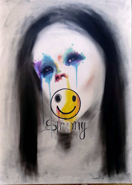 l'opera vuole rappresentare la disperazione di un sorriso sforzato di quando ti dicono " DAU SI FORTE,SI STRONG" e invece vorrsti solo piangere lacrime di tutti i colori