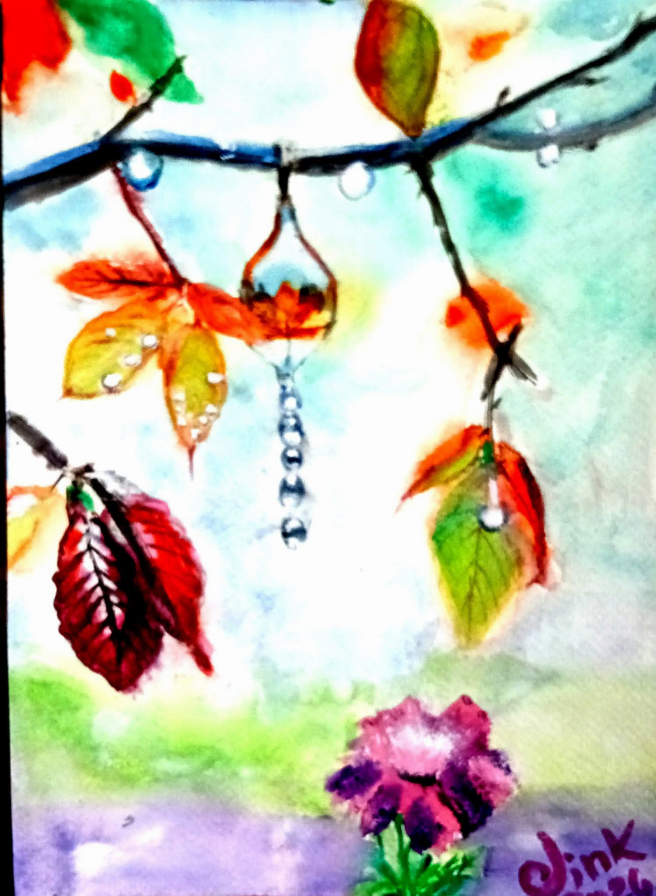 Mi piacciono i riflessi e ho cercato di riprodurne alcuni. Le foglie accolgono le gocce d'acqua ma ci voleva qualcosa che vegliasse su di loro, ci voleva un fiore.