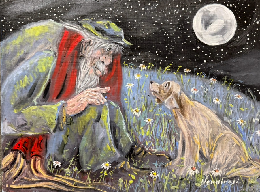 Viandante , sciarpa rossa, cane, luna, margherite