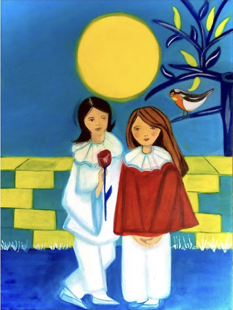 L’opera si presenta con un linguaggio visivo semplice e immediato, che richiama un immaginario fiabesco, ma rivela una struttura simbolica più profonda. Le due figure femminili, accostate ma emotivamente distanti, incarnano una dualità espressa attraverso il cont... ( leggi tutto )rasto cromatico tra bianco e rosso.